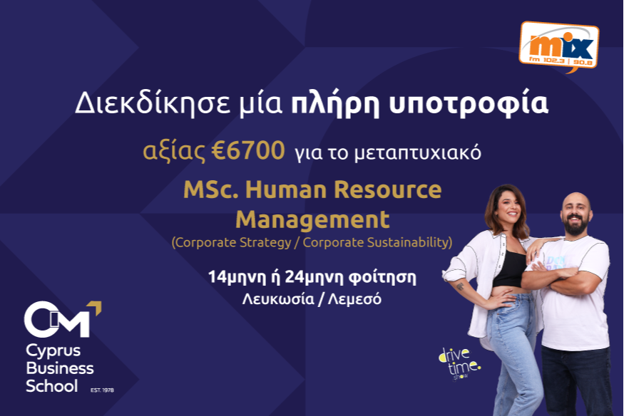 Διεκδίκησε μία πλήρη υποτροφία για το πρόγραμμα Master of Science in Human Resource Management αξίας €6700 που προσφέρει το CIM - Cyprus Business School, ένα από τα κορυφαία ακαδημαϊκά Ιδρύματα της Κύπρου.