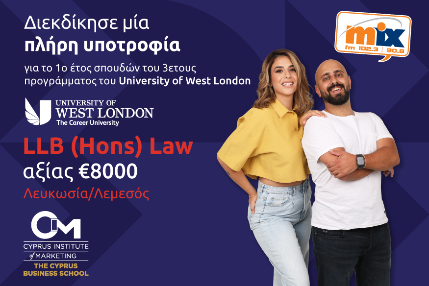 Διεκδίκησε μια πλήρη υποτροφία για το 1ο έτος σπουδών του 3ετους προγράμματος του University of West London, LLB (Hons) Law, αξίας €8000 που προσφέρει το Cyprus Institute of Marketing, το 1ο Κυπριακό Business School και ένα από τα κορυφαία ακαδημαϊκά Ιδρύματα της Κύπρου!