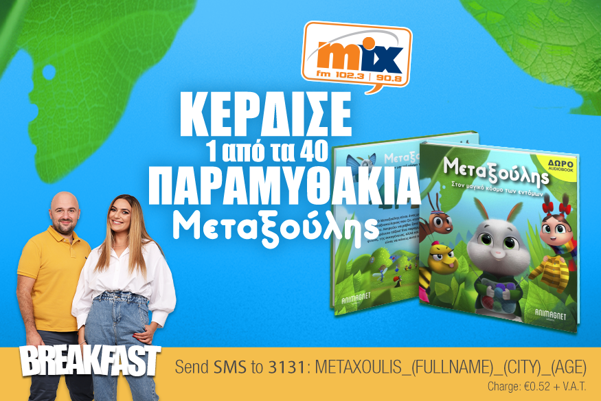Αν θες να κάνεις δικό σου 1 από τα 40 παραμυθάκια του Μεταξούλη, συντονίσου στο The Mix FM Breakfast Show, στείλε μήνυμα στο 3131 με την ένδειξη metaxoulis_ονοματεπώνυμο_πόλη και ηλικία και μπες στην κλήρωση.