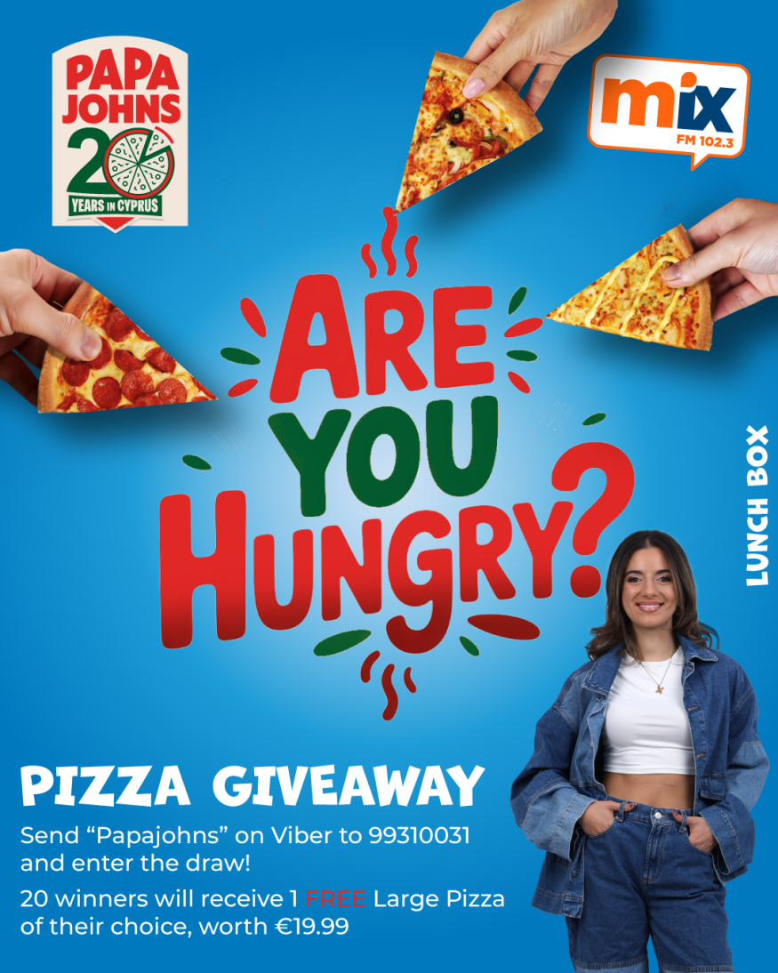 Ο Mix FM και η Papa John’s Κύπρου ενώνουν δυνάμεις και χαρίζουν 20 Μεγάλες Πίτσες, αξίας €19,99 η καθεμία, σε 20 τυχερούς ακροατές.