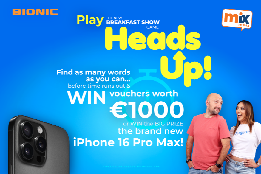 Η Bionic και το Breakfast Show σου δίνoυν την ευκαιρία να κερδίσεις πρώτος το νέο iPhone 16 pro max αλλά και vouchers αξίας €1000 για να κάνεις τις αγορές σου από τα καταστήματα Bionic! Συντονίσου καθημερινά από τη Δευτέρα 16 Σεπτεμβρίου στο Βreakfast Show, στείλε μήνυμα στο 3131 ή στο viber 99 310031 με την ένδειξη ΒionicHeadsUp_Ονοματεπώνυμο_