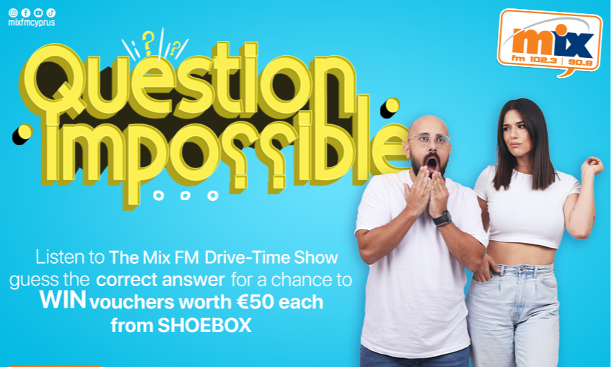 Συντονίσου καθημερινά στο Drive-Time Show, άκου την ερώτηση που θέτουν η Έλενα και ο Στέλιος, βρες τη σωστή απάντηση και στείλε γραπτό μήνυμα στο 3131 ή στο viber 99 31 00 31 και μπες στην κλήρωση για vouchers αξίας €50 από τα καταστήματα SHOEBOX!
