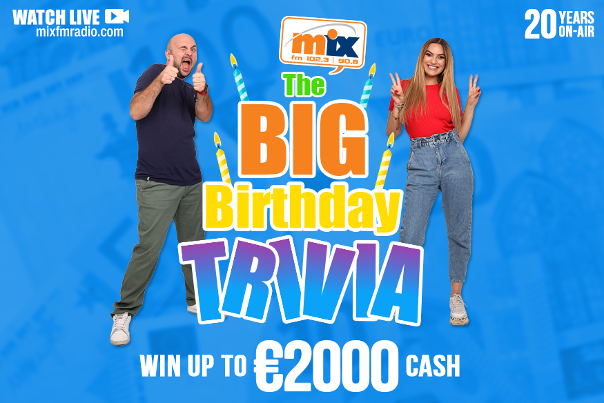 O Mix FM γιορτάζει και σας χαρίζει κάθε μέρα €100 μετρητά μέσα από το νέο παιχνίδι του The Mix FM Breakfast Show: The Big Birthday Trivia. Από τη Δευτέρα 28 Φεβρουαρίου και για έναν ολόκληρο μήνα, αναζητούμε τους ακροατές που θα απαντήσουν σωστά στις ερωτήσεις των Ιωάννα και Πλάτων κερδίζοντας μέχρι και €2000 μετρητά!