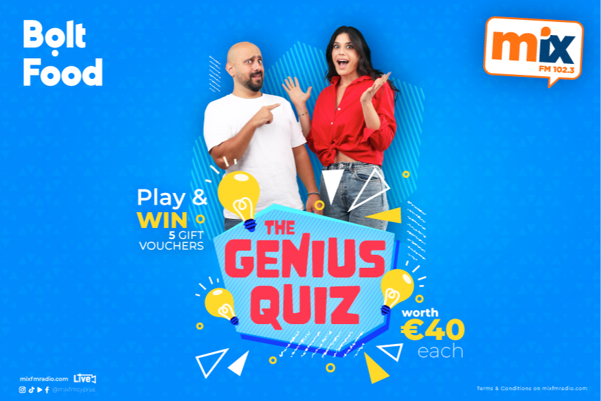Συντονίσου καθημερινά στο The Mix FM Drive-Time Show στείλε μήνυμα στο 3131 ή Viber 99 310031 με την ένδειξη genius_ oνοματεπώνυμο_ πόλη και ηλικία και μπες στην κλήρωση και διεκδίκησε καθημερινά ένα voucher αξίας €40 ευρώ από BOLT FOOD! Η Έλενα και ο Στέλιος θα σε καλέσουν να βγεις live στον αέρα της εκπομπής κάνοντας σου μια ερώτηση στην οποία η απάντηση είναι πιο εύκολη απ' όσο νομίζεις - απάντησε σωστά και κέρδισε!