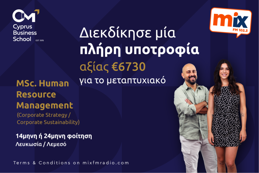 Διεκδίκησε τώρα μία πλήρη υποτροφία για το πρόγραμμα MSc. Human Resource Management (Corporate Strategy /Corporate sustainability), Λευκωσία/Λεμεσός, αξίας €6730 που προσφέρει το CIM - Cyprus Business School, ένα από τα κορυφαία ακαδημαϊκά Ιδρύματα της Κύπρου.