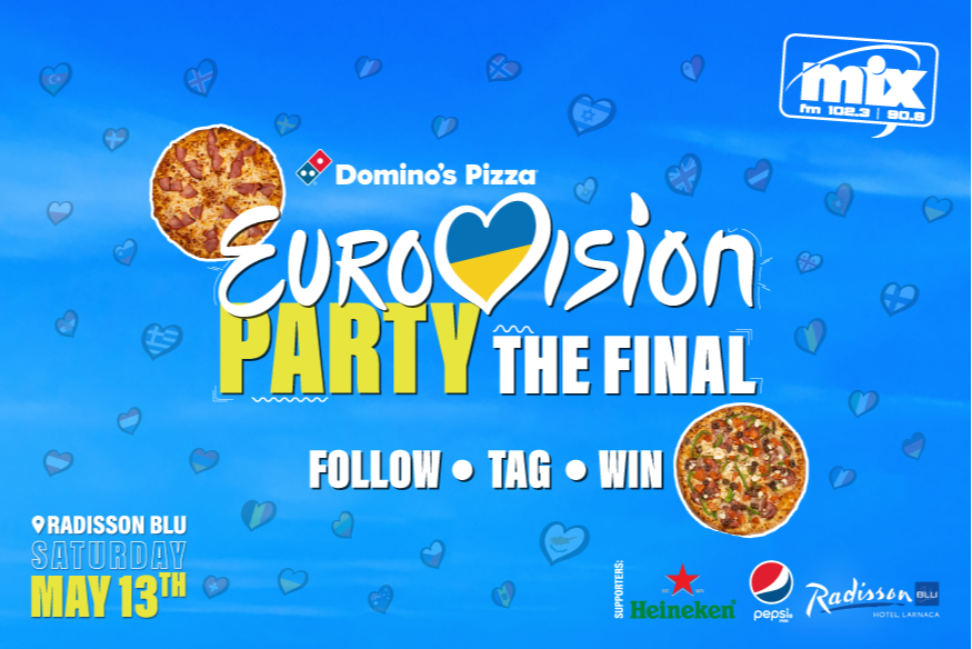 H Domino’s παρουσιάζει... Eurovision Party : The Final! Αν είσαι fan της Eurovision τότε μάζεψε την παρέα σου και λάβε μέρος στον διαγωνισμό για να κερδίσεις μια θέση στο party που διοργανώνει η Domino’s Pizza και ο Mix FM το Σάββατο, 13 Μαίου, την ημέρα του μεγάλου τελικού στον 16ο όροφο του Radisson Blu στη Λάρνακα.
