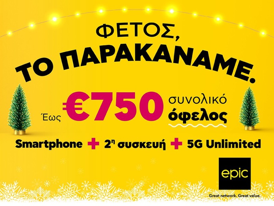 Αυτά τα Χριστούγεννα, το παρακάναμε. Ετοιμάσου για ανεπανάληπτες προσφορές που δεν θα πιστεύεις! Γιατί φέτος, η Epic σού δίνει την ευκαιρία να αποκτήσεις νέο smartphone και μαζί μία δεύτερη συσκευή και πλάνο 5G Unlimited, όλα με συνολικό όφελος έως €750.