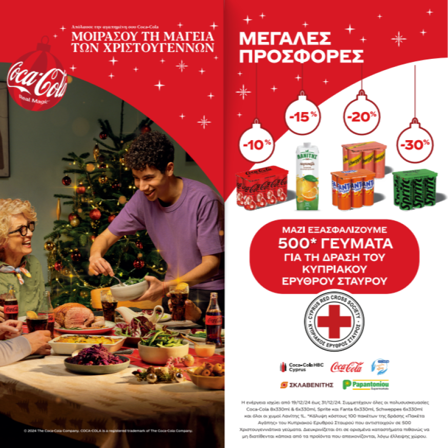 Κάνοντας πράξη το κεντρικό μήνυμα της καμπάνιας της Coca-Cola «Η Συνταγή της Μαγείας», με στόχο να φέρει το γιορτινό φαγητό στο Χριστουγεννιάτικο τραπέζι με παγωμένη Coca-Cola σε κάθε σπίτι, η Coca-Cola HBC Κύπρου ενώνει τις δυνάμεις της με τα καταστήματα Σκλαβενίτη για καλό σκοπό. Μέσα από αυτή τη συνέργεια που αφορά σε επιλεγμένα προϊόντα από το χαρτοφυλάκιο της Coca-Cola HBC Κύπρου, καλύπτει το κόστος για 100 πακέτα αγάπης, τα οποία ισοδυναμούν με 500 γεύματα, τα οποία θα διοχετευτούν σε ευάλωτες οικογένειες που το έχουν ανάγκη μέσω της δράσης «Πακέτα Αγάπης» του Κυπριακού Ερυθρού Σταυρού.