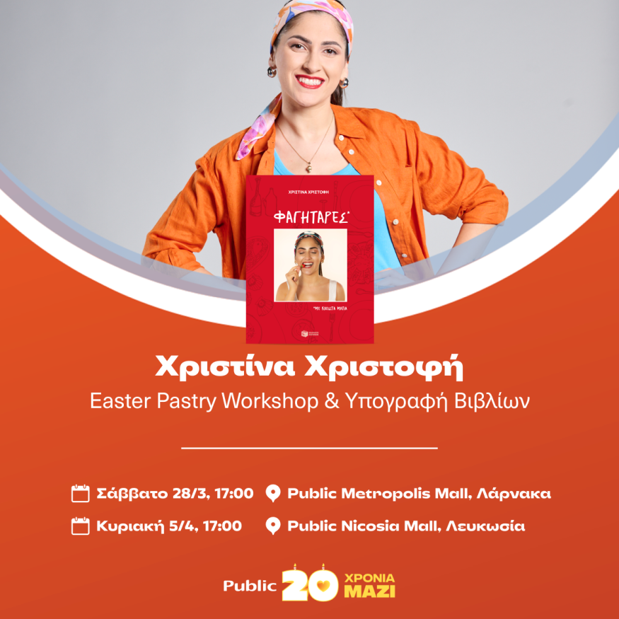 Η ταλαντούχα σεφ θα βρεθεί στα καταστήματα Public σε Λάρνακα και Λευκωσία για να παρουσιάσει ένα απολαυστικό Easter Pastry Workshop, όπου θα ετοιμάσει πασχαλινές λιχουδιές και θα μοιραστεί ιδέες και έμπνευση για το γιορτινό τραπέζι. Παράλληλα, το κοινό θα έχει την ευκαιρία να γνωρίσει από κοντά τη Χριστίνα Χριστοφή και να αποκτήσει υπογεγραμμένα αντίτυπα του βιβλίου της «Φαγητάρες με κλειστά μάτια».